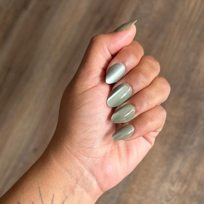 - A sage green mani with a magnetic velvet effect in an almond medium shape. The realest-looking fake nails you've ever seen.