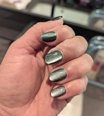 - A deep black mani with lots of shimmer in an extra short round shape.