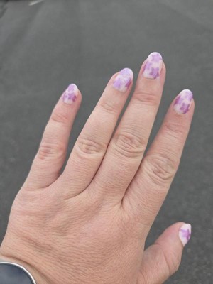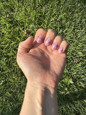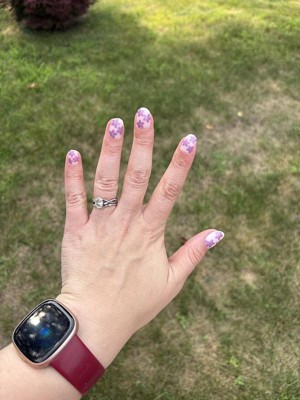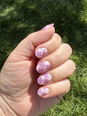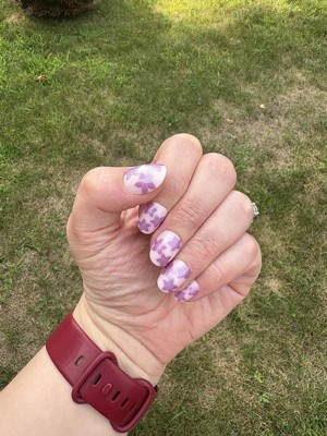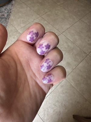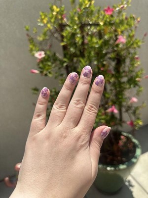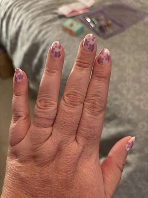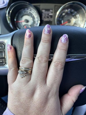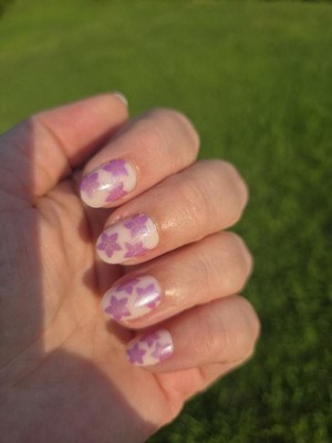 A classic sheer pink base with fun purple/chrome flowers. The extra short round shape gives them a perfect mix of fun yet practical. They were very easy to apply and lasted two weeks.