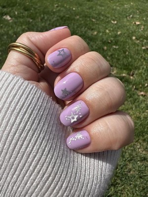 - An iridescent lavender manicure accented by shimmery stars in an extra short round shape
