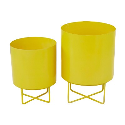 - This set of 2 yellow metal planters comes with cylindrical pots and x-shaped stands