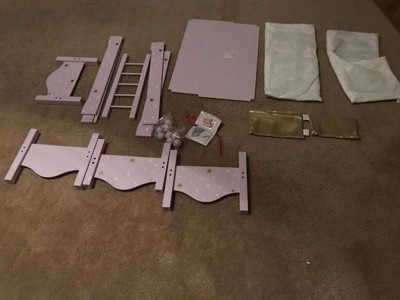 [This review was collected as part of a promotion.] My oldest daughter (who will be 6 in January) has an American Girl Doll that she has been loving to play with. She had a single bed and when I upgraded to the bunk beds she was ecstatic as now she can also allow her little sister to place her doll on the bottom bunk! Construction was time consuming and the directions were not 100% clear. There were some flaws in the paint and the wooden dowels to hold the top and bottom bunk together did not quite fit as well as they should. The balls on the top of the bunk bed for decoration also do not fit securely in place and fall out easily. I was unsure if is how the product is supposed to be or if perhaps we had some faulty pieces. Due to this, it's not quite as fun as it could be as the kids keep having to repair and put the bed back together while playing The ladder also does not rest on the bed very easily as it is almost too short. My kids LOVE the color and love that their babies can share a bunk bed as they do so it's not an awful item to have. I hope to see it hold up so my kids can get many more enjoyable hours of play. Neat concept just not fully executed.