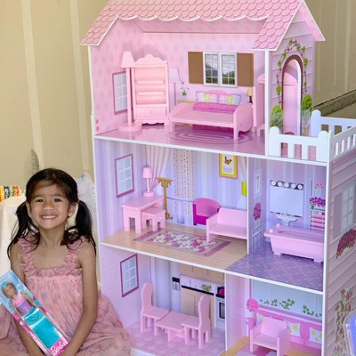 I purchased this dollhouse for my 5 year old daughter for her birthday. She wanted a dollhouse big enough for her Barbies to stand and comfortably fit. This dollhouse is just that. The dollhouse is wide and tall (taller than my 5 year old), however, she has a fairly large room and separate toy room so space was not an issue. It took roughly an hour to assemble and we are missing the screws for the bed, but I’m sure we have some extra screws in the house that will fit so not a big problem. The design is really cute and we love the furniture pieces it came with. My daughter and I plan to paint some of the furniture piece so everything isn’t pink, but overall extremely satisfied with the dollhouse.