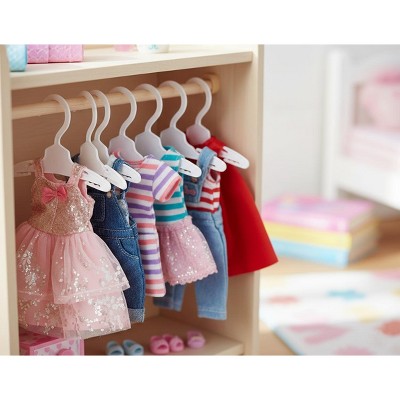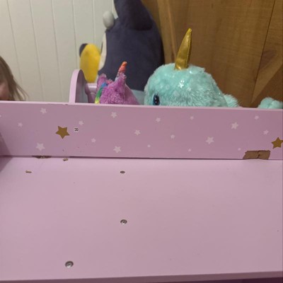 This compact all-in-one nursery toy is the perfect way to care for baby dolls or stuffed animals. Features a changing table with a mobile with golden stars, a sink for baths with a hand-held nozzle, a highchair, and multiple storage spaces. A great option for bedrooms and playrooms where space is at a premium. Made of durable MDF construction, its lilac finish features white and gold stars accents. Three hangers and a set of white with gold star cushions are included too.