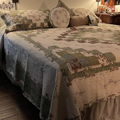 The Olivia Bedspread is in a delightful, classic square pieced pattern. Romantic florals, in shades of green, are accented with a pretty, floral vine embroidery motif to create a timeless look. The traditional vermicelli quilting pattern is the perfect finishing touch. This colorful pieced patchwork bedspread is sure to brighten up any bedroom.