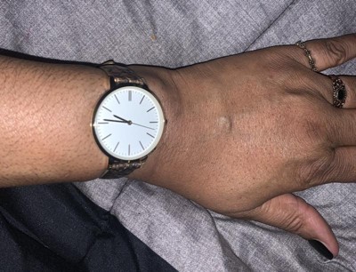 Slim and classic design. Nice for an office setting or daily use. I would have liked it to have a little more weight to it but it keeps time well! The gold looks nice against the watch band and it looks great with most outfits!