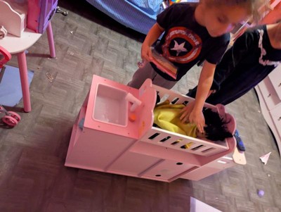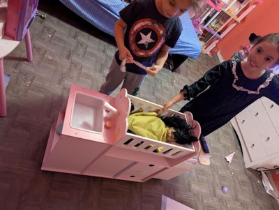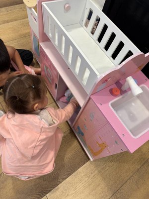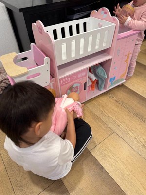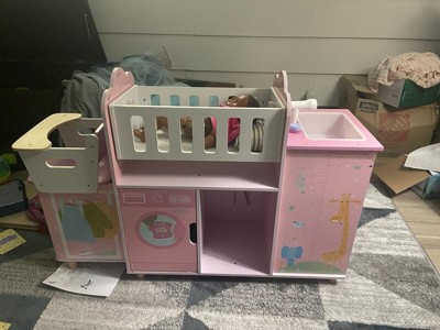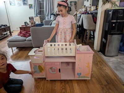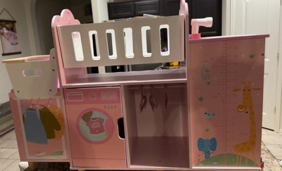 This spacious and realistic doll nursery features a rocking crib, a detachable high chair, and a sink for baths. Below, a washing machine, and multiple cabinets and shelves, including three hangers, provide storage for baby doll clothes and accessories. In a soft pink palette with nursery-friendly animals and a growth chart illustrated, it is made of engineered wood with rounded edges and kid-safe finish to withstand hours of toddler play time.
