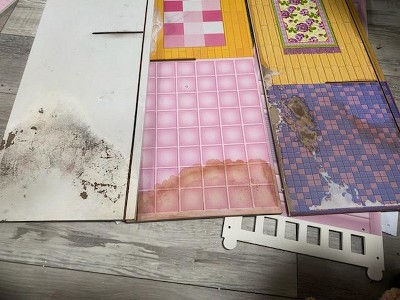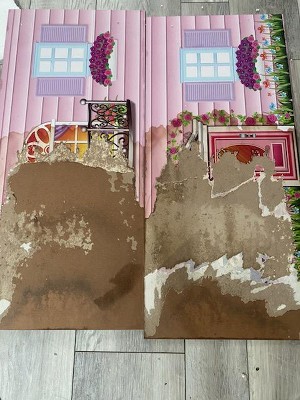 Arrived with severe water damage and large brown stains on multiple panels of the doll house, destroying the wallpaper along with it. Also had a strong mold/rot smell.