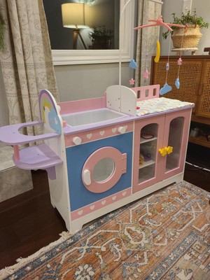 [This review was collected as part of a promotion.] This baby changing station is absolutely adorable! It has a changing table, sink, high chair, washing machine, shelves, and closet. It is the perfect height for little ones to play with. My daughter loves it!