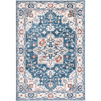 Our rug is adorned with an intricate array of designs, featuring a central medallion encircled by scrolling vines and geometric accents, all in a serene palette of blue and ivory with warm pops of orange, conveying a timeless appeal. The edges of the rug are framed with a detailed border, adding an extra layer of sophistication.
