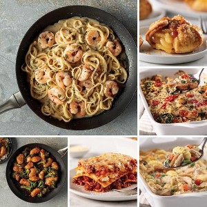 Gourmet Made Easy By Omaha Steaks. | 1 Skillet Meal: Shrimp Scampi (24 oz. pkg.), 1 Skillet Meal: Sesame Chicken (24 oz. pkg.), 1 Meat Lover’s Lasagna (30 oz. tray), 1 Baked Chicken & Dumplings (31.5 oz. tray), 1 Baked Lemon Chicken With Orzo (32 oz. tray), 4 Individual Baguettes With Garlic Butter (3 oz.), 4 Caramel Apple Tartlets (4 oz.)