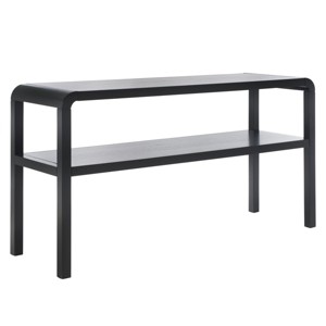 Uplift your home with the modern charm and elegance of our Omara console table. The refined and streamlined design of the console table is accentuated by curved edges and slender legs. Crafted with solid wood in a sleek black finish, our console table lends an elegant and effortless touch to any corner. It features two tiers to maximize space for both display and storage, to feature as a versatile sofa or entryway table, or even a minibar or buffet.