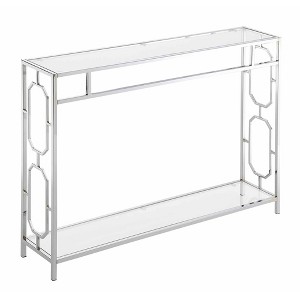 Ideal to bring your home decor to the next level, the Omega Chrome Console Table with Shelf by Breighton Home can create an essence of elegance. Its sleek modern contemporary style will leave you breathless as you place it in your living room, entryway or hall, it is sure to become your favorite furniture piece. The two distinctive octagonal cutouts on each side frame adds to its stylish design. Made from chromed metal, the frame is long lasting and easy to clean. Both the top and bottom shelves are crafted from clear tempered glass and are also easy to clean. This two tier unit also offers enough room to optimize your display and storage space. Use the tabletop to keep your out the door essentials handy while decorating the bottom shelf with your favorite collectibles or books. Bring home today and enjoy the simple and fast 4 step assembly that this accent table provides. Part of the Omega Collection by Breighton Home. Love the look? Pair with the Omega Chrome Coffee Table with Shelf and the Omega Chrome End Table with Shelf by Breighton Home. Each sold separately.