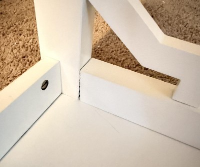 I really like the look of this table and am quite happy with it. Assembly wasn't too difficult for me. It might have been nicer to have white pegs to hide the side bolts, but you really don't notice the plastic stickers.