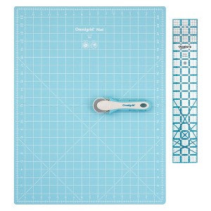 The Omnigrid Folding Cutting Kit includes a rotary cutter, 3"x 18" ruler, and a 18"x 24" folding mat that folds to 18"x 12". The mat and ruler feature precision printed measurements, diagonal lines, and left and right handed numbering. Mat designed for smooth cutting across the folding edge. Ruler has slip-resistant ink and 1/8" grid marking. Rotary cutter allows for left or right-hand use without blade change. Soft-cushion handle reduces wrist strain and fatigue.