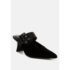 Introducing the finely crafted microfiber mules with a pointed toe design. Featuring a buckle strap detail and plush cushioned insoles, they embrace your feet like a cozy quilt. Easy to slip on and off, these mules pair perfectly with chinos or tailored pants. Type: Mules Upper Material: Microfiber Outer Sole: TPR Closed Pointed Toe  Flared Slim Block Heel Buckle Strap Detail Comfortable Cushion Insole Slip-On Design Heel Height: 3 inches SH5369