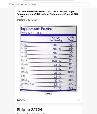 Buyer beware! False advertising! The oncovite is not what is pictured not are the ingredients anything like what is advertised!