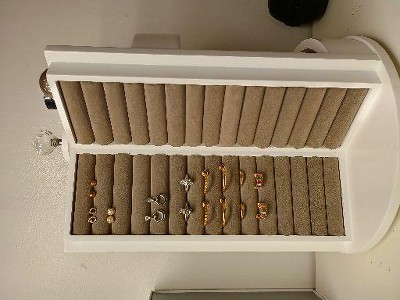 - ALL-IN-ONE - Features 6 necklace mounts 28 ring and earring shelves and 2 rounded storage shelves to store all your jewelry and accessories at your bathroom vanity in a compact space.