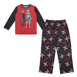 Set sail for dreamland with this boy's 2-pack One Piece pajama set featuring a red crew neck long sleeve shirt with Luffy beside the Straw Hat Pirates logo and bold white and red "Luffy Straw Hat Crew" text. The matching black pajama pants display an all-over print of the Straw Hat Pirates logo, kanji, and other iconic series symbols. Crafted from flame resistant polyester, this set ensures safety while maintaining cozy comfort. Wash before wear. Turn inside out. Use detergent to retain flame resistance. Avoid soap and fabric softener. Machine wash cold with like colors. Use only non-chlorine bleach when needed. Tumble dry low. Do not iron or dry clean.