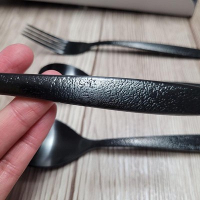 [This review was collected as part of a promotion.] This silverware is great! First of all, I love the color. The black is something different than I’m used to, and I’m here for it. I really like the textured feel/pattern on the handles. The weight of the individual pieces is nice also…they’re heavy without giving you a cramp. They wash very cleanly in the dishwasher and had no spots or residue. I really like that this can be used for everyday dining or if you want something a bit more dramatic. I love this set!