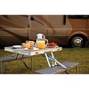 - FOLDING TABLE EASE - Measuring 53.5 by 32 by 26.5 inches when open, this camping table features a durable aluminum frame and easily collapses into a 33.5 by 13 by 4 inch suitcase-style case for transport