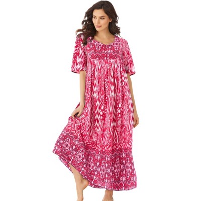 Embrace comfort and style with the beautiful prints and full sweeping silhouette of our Bib Front Lounger. Features a sweetheart neckline bib with three buttons in a coordinating pattern to match the hem..