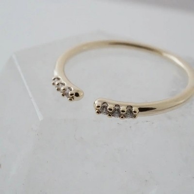 A slim, polished open band accented with three tiny crystals on each end - subtle sparkle with a thoughtful twist. This timeless silhouette is perfect worn solo for a hint of shine or stacked with your favorite rings for a more layered look. Slightly adjustable for a comfortable fit, it’s a versatile piece you'll reach for on repeat. Fits sizes 5.5 - 7.5.