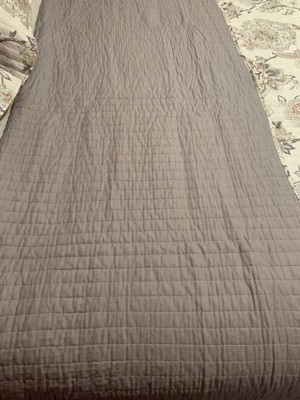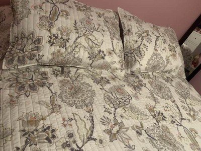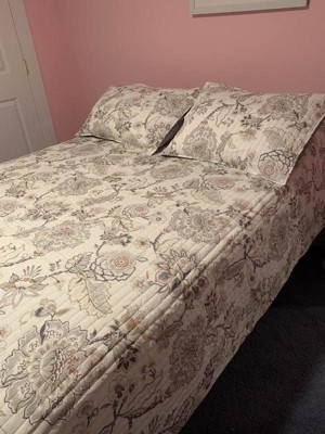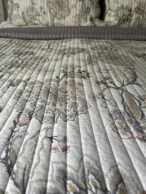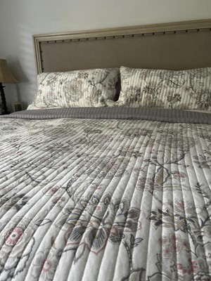The Ophelia Reversible Quilt Set by Levtex Home is inspired by a beautiful garden of floral vines. Offered in grey, taupe, blush and cream, this design will immediately transform your bedroom. This reversible quilt features an elegant array of blooming floral vines on a cream ground on the front, reversing to a classic solid gray on the back. The Quilt and Shams have a rayon front and cotton back, filled with a cotton-rich filler, and are machine washable. Enjoy this for years to come!