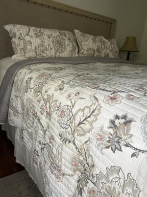 [This review was collected as part of a promotion.] I have been looking to update my bedding and this set was the perfect choice. This set comes with the quilt and 2 pillow shams. This set is absolutely beautiful! The color combination of grey, taupe, blush and cream is perfect! All the colors coordinate so well together. The one side of the quilt and shams features a floral design and on the back side of the set it is a solid gray color. I like that you switch up the sides to create a different look in your bedroom. This quilt fits perfectly on my full bed. This set is great quality and the quilt is very soft and comfortable. Prior to using this set, I did wash and dry it and it came out as good as new! This set has definitely updated the look of the bedroom. If you’re looking for a quilt set that looks and feels luxurious, then I highly recommend this one! This quilt set would also make a fabulous gift!