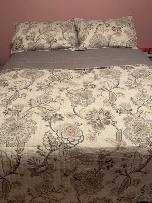 [This review was collected as part of a promotion.] I have been looking to update my bedding and this set was the perfect choice. This set comes with the quilt and 2 pillow shams. This set is absolutely beautiful! The color combination of grey, taupe, blush and cream is perfect! All the colors coordinate so well together. The one side of the quilt and shams features a floral design and on the back side of the set it is a solid gray color. I like that you switch up the sides to create a different look in your bedroom. This quilt fits perfectly on my full bed. This set is great quality and the quilt is very soft and comfortable. Prior to using this set, I did wash and dry it and it came out as good as new! This set has definitely updated the look of the bedroom. If you’re looking for a quilt set that looks and feels luxurious, then I highly recommend this one! This quilt set would also make a fabulous gift!