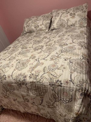 The Ophelia Reversible Quilt Set by Levtex Home is inspired by a beautiful garden of floral vines. Offered in grey, taupe, blush and cream, this design will immediately transform your bedroom. This reversible quilt features an elegant array of blooming floral vines on a cream ground on the front, reversing to a classic solid gray on the back. The Quilt and Shams have a rayon front and cotton back, filled with a cotton-rich filler, and are machine washable. Enjoy this for years to come!