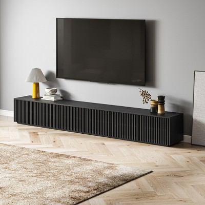 This elegant TV stand combines spacious storage and sophisticated design, featuring a wide tabletop and adjustable shelves perfect for displaying media devices or decorative items. Unique arch doors and cylindrical wood legs add a touch of elegance, seamlessly elevating your home's place. Built-in cable holes keep wires neatly organized and out of sight, creating a clutter-free and visually appealing media area. Crafted from premium particle board with five hard wood legs for enhanced durability, this TV cabinet is designed for long-lasting stability. The combination of adjustable shelving and ample surface space offers versatile storage solutions, helping you maintain a tidy and organized living space.