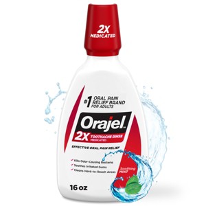 Orajel Toothache Rinse is the first and only double medicated oral rinse for the temporary relief of pain due to toothaches and minor irritation of the mouth and gums, or occasional minor irritation, pain, sore mouth and sore throat. Use the rinse multiple times a day to help relieve toothache pain. A great remedy to use at home and help treat the pain.