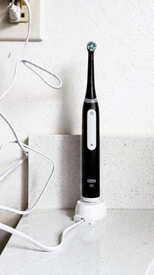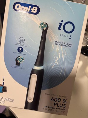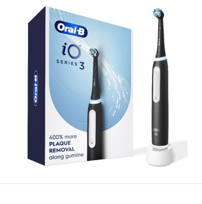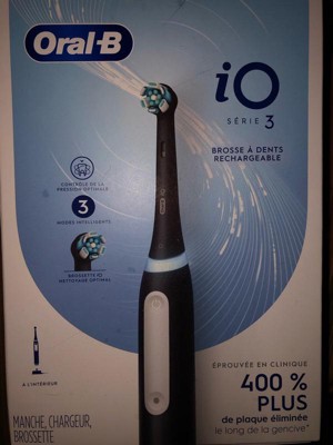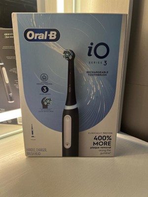 The Oral-B iO Series 3 Electric Toothbrush features Oral-B's best technology, combining a dentist-inspired round brush head with micro-vibrating bristles for a professional purifying clean feel at home. This rechargeable toothbrush is clinically proven to remove 400% more plaque along the gumline* *vs. regular manual toothbrushes. The Built-in 2-Minute Timer breaks the two minutes up into four 30-second intervals to brush each quadrant of your mouth - to help you get a complete clean on all your teeth. We watch the time, so you don't have to! Plus, the Pressure Sensor indicates optimal cleaning pressure and warns of too much pressure. The display panel lets you select brushing modes, alerts you when battery is low, and signals when it's time to replace your brush head. Oral-B-the #1 brand used by dentists worldwide.*