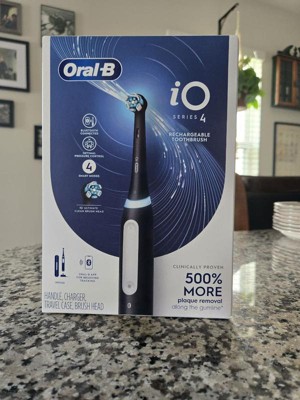 The Oral-B iO Series 4 Electric Toothbrush features Oral-B's best technology, combining a dentist-inspired round brush head with micro-vibrating bristles for a professional purifying clean feel at home. This rechargeable toothbrush is clinically proven to remove 500% more plaque along the gumline* *vs. regular manual toothbrushes. The Built-in 2-Minute Timer breaks the two minutes up into four 30-second intervals to brush each quadrant of your mouth - to help you get a complete clean on all your teeth. We watch the time, so you don't have to! Plus, the Pressure Sensor indicates optimal cleaning pressure and warns of too much pressure. The display panel lets you select brushing modes, alerts you when battery is low, and signals when it's time to replace your brush head. Oral-B-the #1 brand used by dentists worldwide.*