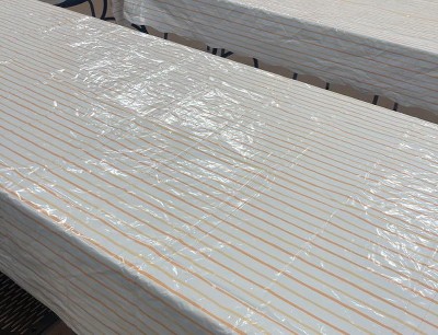 A: Hello Texaswildflower - We appreciate your interest for this item. No, the Orange and White Striped Print Table Cover does not have a soft backing and it is made from durable polyethylene material. I hope it helps - Juliette.