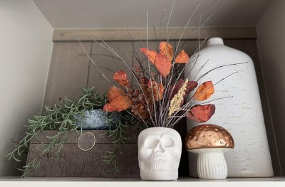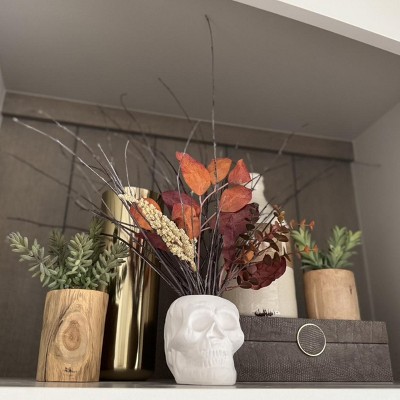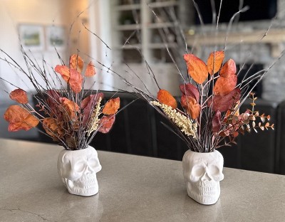 1 of these divided in 1/2 + 2 $3 Bullseye Terracotta Skulls + birch twigs from the yard = A fun fall $5.50 (per) DIY accessory! 🍁💀🍂