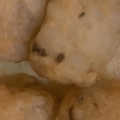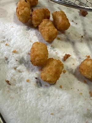 Bag was full of moldy black spotted potato chunks. Every single tot had black rotten potato bits. I had to throw the whole bag away. So gross, never buying these again