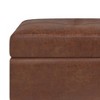 Hand constructed using solid wood, engineered wood and high density foamUpholstered with a durable Distressed Saddle Brown Vegan Faux LeatherFeatures lift open lid with child safety hinge, serving tray and large interior storageMulti-functional ottoman can be used in bedroom, living room, family room, hallway as an entryway bench, foot stool, accent furniture or provide additional sittingContemporary design includes tufting and top stitching detailSimple assembly; just attach legsDimensions: 21.1in D x 42.3in W x 17.9in HEfforts are made to reproduce accurate colors, variations in color may occur due to computer monitor and photography