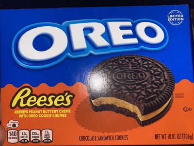 - Creme filling made with real REESE'S Peanut Butter sauce and OREO cookie crumb inclusions sandwiched between two signature OREO chocolate wafer cookies