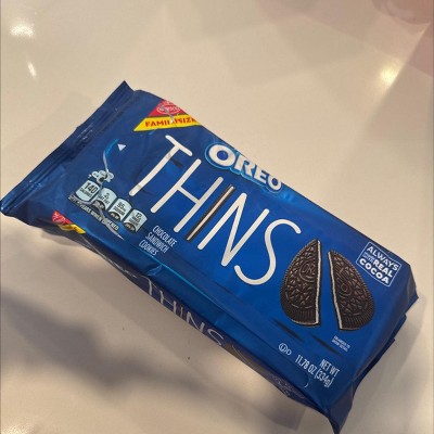 - One 11.78 oz family size pack of OREO Thins Chocolate Sandwich Cookies (packaging may vary)