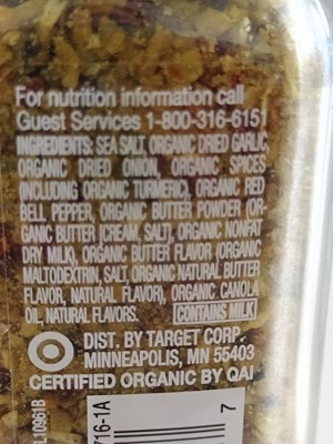 sea salt, organic dried garlic, organic dried onion, organic spices (including organic turmeric), organic red bell pepper, organic butter powder (organic butter (cream, salt], organic nonfat dry milk), organic butter flavor (organic maltodextrin, salt, organic natural butter flavor, natural flavor), organic canola oil, natural flavors.' '