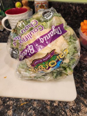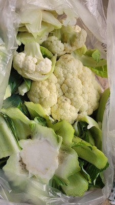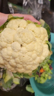 I wish shoppers had a better idea of how to pick produce. This head of cauliflower is 70% greens and 30% vegetable. At $3.99 for head head i would expect to be able to serve my family. There is only enough here for a single serving. It is nice and fresh, no mold or spots but a disappointment.