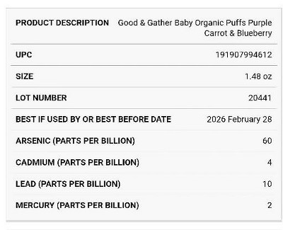 Baby loved but if you scan the qr code and check it has high levels of arsenic and lead all batches are different