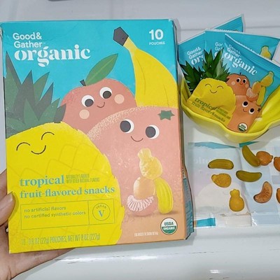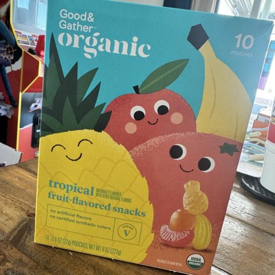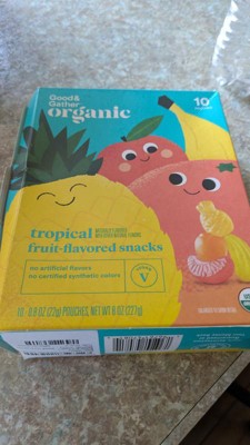 [This review was collected as part of a promotion.] These are the Good&Gather organic tropical fruit-flavored snacks. There are 10 small pouches that are 70 calories each. There are 4 flavors: banana, pineapple, orange and grapefruit. These are very soft and each flavor is delicious. My only issue is that these are so good the kids eat the bag up too quick! These are a great snack for school, going to the park and everyone needs at least one of these for their lunch. I received an incentive to write this review.
