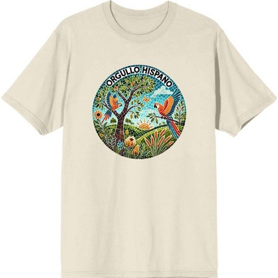 Showcase your pride in Hispanic heritage with this crew neck short sleeve apparel adorned with stunning mosaic art of parrots perched on a hillside at sunrise. Above this vibrant scene, bold black text proclaims "Orgullo Hispano," making a beautiful statement about identity and culture. Crafted from high-quality materials, this shirt ensures comfort and durability for everyday wear or special occasions. It's easy to care for. Simply machine wash it on cold with like colors and tumble dry on low heat.