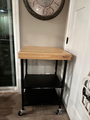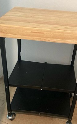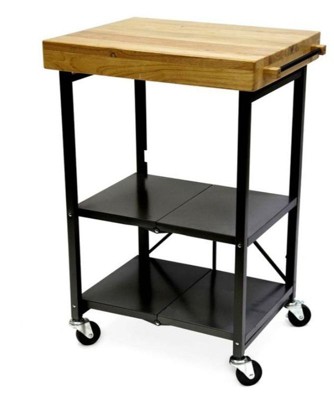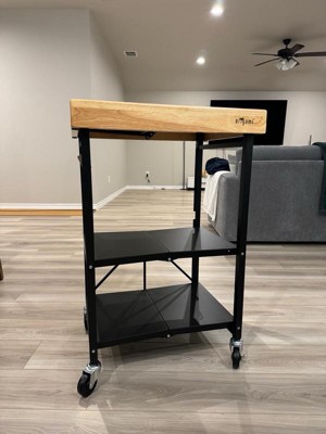[This review was collected as part of a promotion.] This cart is the same height as my kitchen island. This gives me extra prep space when cooking large meals. The wooden top is quite heavy so be careful when unfolding for the first time. The wheels came unattached, it is stable with or without the wheels so you have the option to install it or not. The caster wheels are heavy duty and glides well. The top can holds up to 100 lbs, middle and bottom holds 50 lbs each. Folding and unfolding is easy and quick once you got the technique. I recommend this if you are looking for a space for cutting or storing small kitchen appliances.