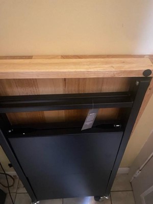[This review was collected as part of a promotion.] This is such a convenient side table. The wooden top is super heavy and sturdy. It collapses really flat and easily tucks away. The wheels move smoothly and the locking mechanism is great. You need some elbow grease to open it up since it’s so sturdy but it’s worth it to have something so substantial.