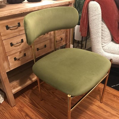 Elevate your dining setup with this Orion Luxe Dining Chair with Brass Legs from Threshold™. This armless dining chair designed with a metal frame and legs with a shiny brass finish adds high-end appeal to your space. Upholstered in a soft velvet fabric with a padded seat and curved backrest, it integrates elegantly with any table setting and offers a comfy sitting experience.