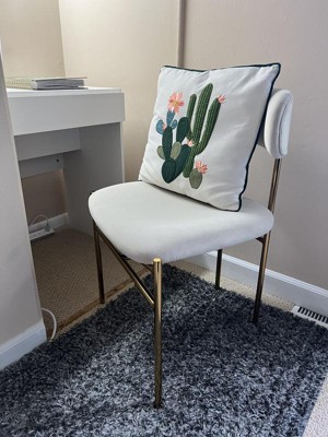 This chair has my compact desk space feeling fancy! Our living space is on the mini side, meaning we often improvise. I’ve been using this dining chair as a desk chair as well, and it’s a very luxe vibe! The chair was a little tricky to unpack because the padding was taped directly to the metal; we struggled to separate the packing without scraping the gold finish. The rest of assembly was easy. The chair feels sturdy and the padding is lovely. The only tricky part will be spot cleaning if it gets dirty—the fabric is quite fine and will definitely require a delicate touch.